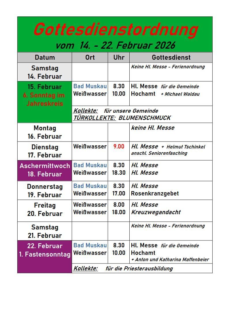 - In der kommenden Woche sind die Hl. Messen planmäßig, die Gottesdienstzeiten am Aschermittwoch entnehmen Sie bitte dem Aushang oder unserer Homepage.
